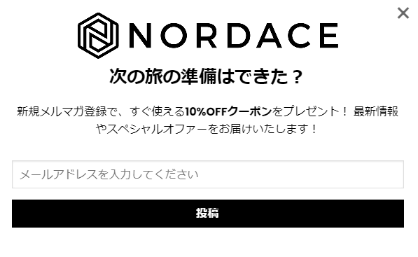 大体15%オフのコードが届くので、お得に購入したいという方はメールアドレスを登録することで割引コードが受け取れるようになります。もちろんメールマガジンは解除可能です。私は新作情報を確認したいので登録したままになっていますが、お得に購入したいという方や新作をチェックしたいという方はNordaceのメールマガジンをチェックするのも良いかもしれません。またブラックフライデーの時期には30%オフになるクーポンコードも送られてくるので、お得にお買い物がしたいという方にはメールマガジンを登録されることをおすすめします。